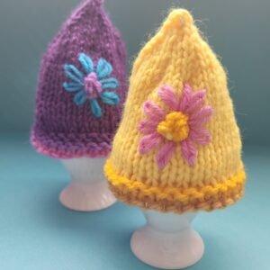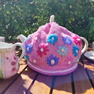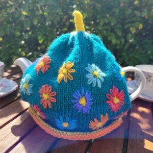 A great weekend project for any knitter using knit and purl stitches. This colourful cosie has one main colour with two contrast colours, plus uses oddments of leftover yarn for the petals. The tea cosie is made from two pieces of knitting with bobbles. The bobbles form the centre of the flowers. The petals around the bobbles are large chain stitches. A great way to use small amounts of yarn left over from other projects.