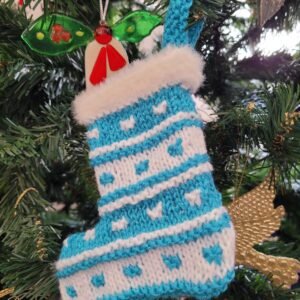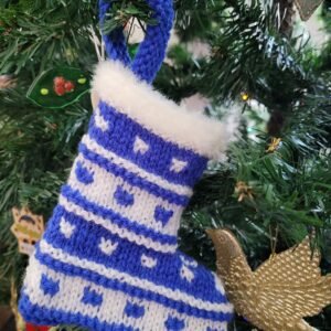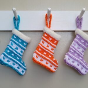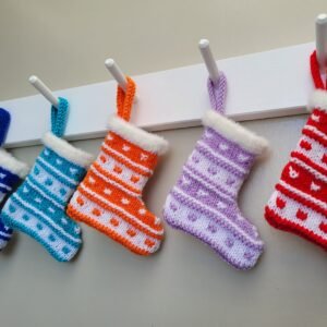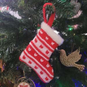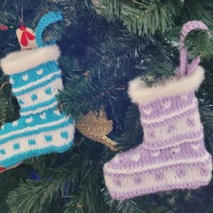 This easy to knit pattern uses two festive colours in a simple pattern with an edging of white fluffy yarn worked in garter stitch. Garter stitch means every row is a knit stitch. The loop used to hang the stocking is also worked in garter stitch. There are a few rows with simple decreases at either the beginning or end of the row, and seams to sew together. You could also use leftover yarn from other projects to make unique, individual stockings. A great way to practice some basic knitting stitches and sewing.
