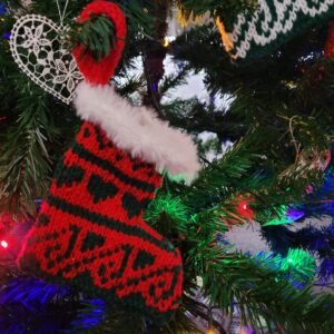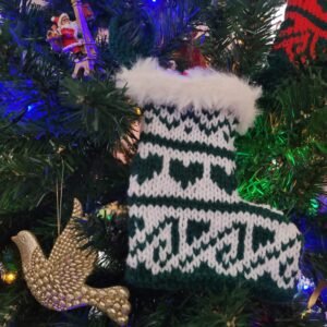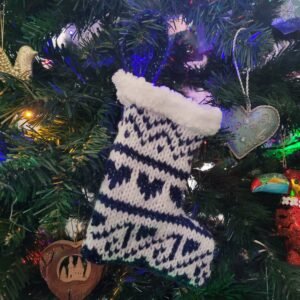 This stocking pattern uses two festive colours in a simple fairisle pattern. Two graphs are provided with the pattern. They are each on an A4 size sheet, in colour, and easy to follow. The white stocking edging and the loop used to hang the stocking from the Christmas tree are worked in garter or knit stitch. There are few rows with simple decreases at either the beginning or end of the row, and three seams to sew together. A great way to practice some basic fairisle knitting and sewing skills.