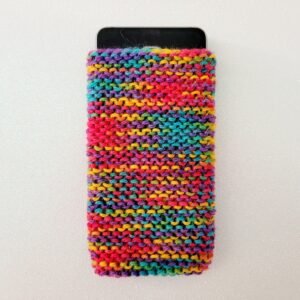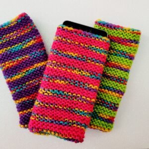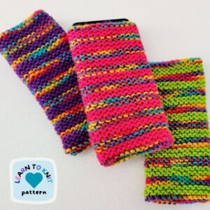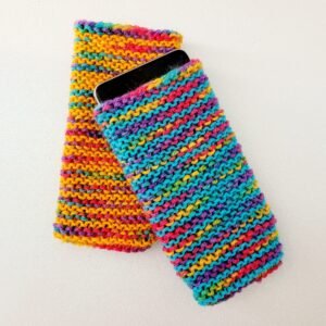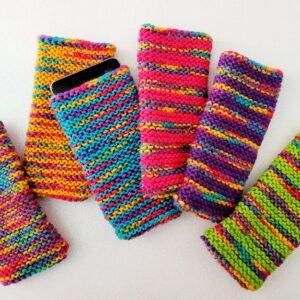 A great practice piece for the new knitter with casting on, using knit only stitches, and casting off. The mobile sock is a single piece of knit only stitches, with a bottom and side seam to sew.