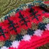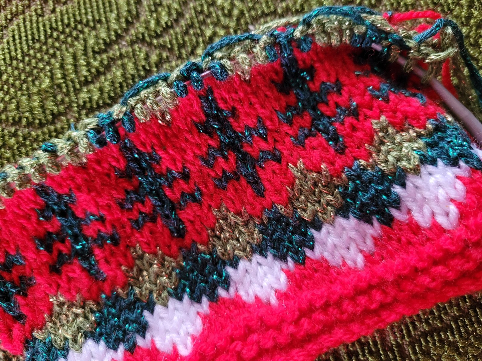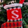 The stocking features an edging of white fluffy yarn worked in garter stitch. The loop used to hang the stocking is also worked in garter stitch. There are a few rows with simple decreases at either the beginning or end of the row, plus the seams to sew together.